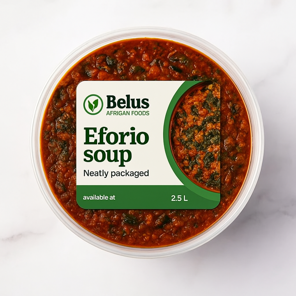 Enjoy the rich, traditional taste of Nigerian cuisine with our freshly prepared Eforiro Soup. Made with finely chopped spinach, assorted meats, and a flavorful blend of spices, this 2.5L pack is perfect for family meals or entertaining guests
